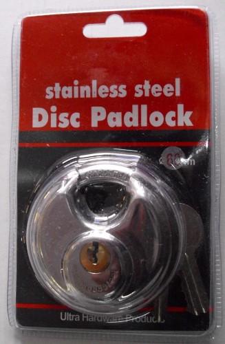 Padlock-Schloss, Diskuss-Schloss, Vorhängeschloss, ca. 60 mm Durchmesser. Stabile Ausführung, Verschlussbolzen aus gehärtetem Stahl. Mit drei Schlüsseln. → zum Angebot