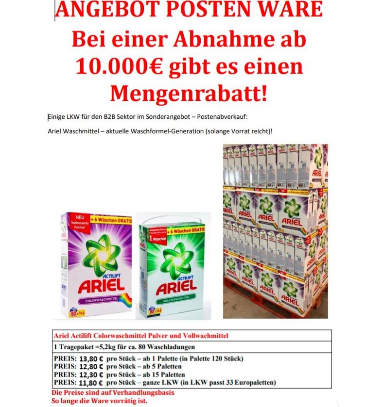 Sonderposten Waschmittel – Vollwaschmittel zum Sonderpreis23 Paletten mit Waschmittel für Wäsche, Vollwaschmittel, Tab Waschmittel. Alles zum günstigen Sonderpreis. Alles Auf Palette. Fast jeder Hersteller für Waschmittel ist vorhanden. Stammt alles aus einer Lagerauflösung in Hamburg. Einige Packungen weisen Beschädigungen auf. Es ist balles Trocken und nichts ist verklumpt. Wurde mit Folie verschlossen. Die Waschmittel sind je Palette nach Hersteller sortiert ...