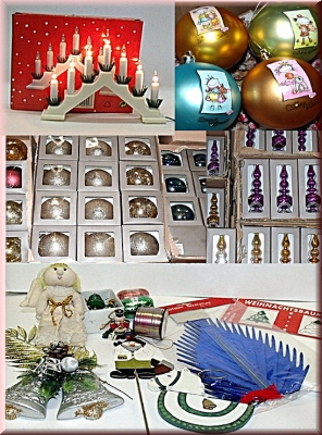 Weihnachtsschmuck aus verschiedenen Materialien, Porzellan, Keramik, Metall, etc, Deko, Tannenartikel, Figuren, Servietten, Füllgefäße Krippen, Sterne, Kerzen, Zubehörartikel, Schleifen, Geschenkverpackung, Karten, Korbwaren,